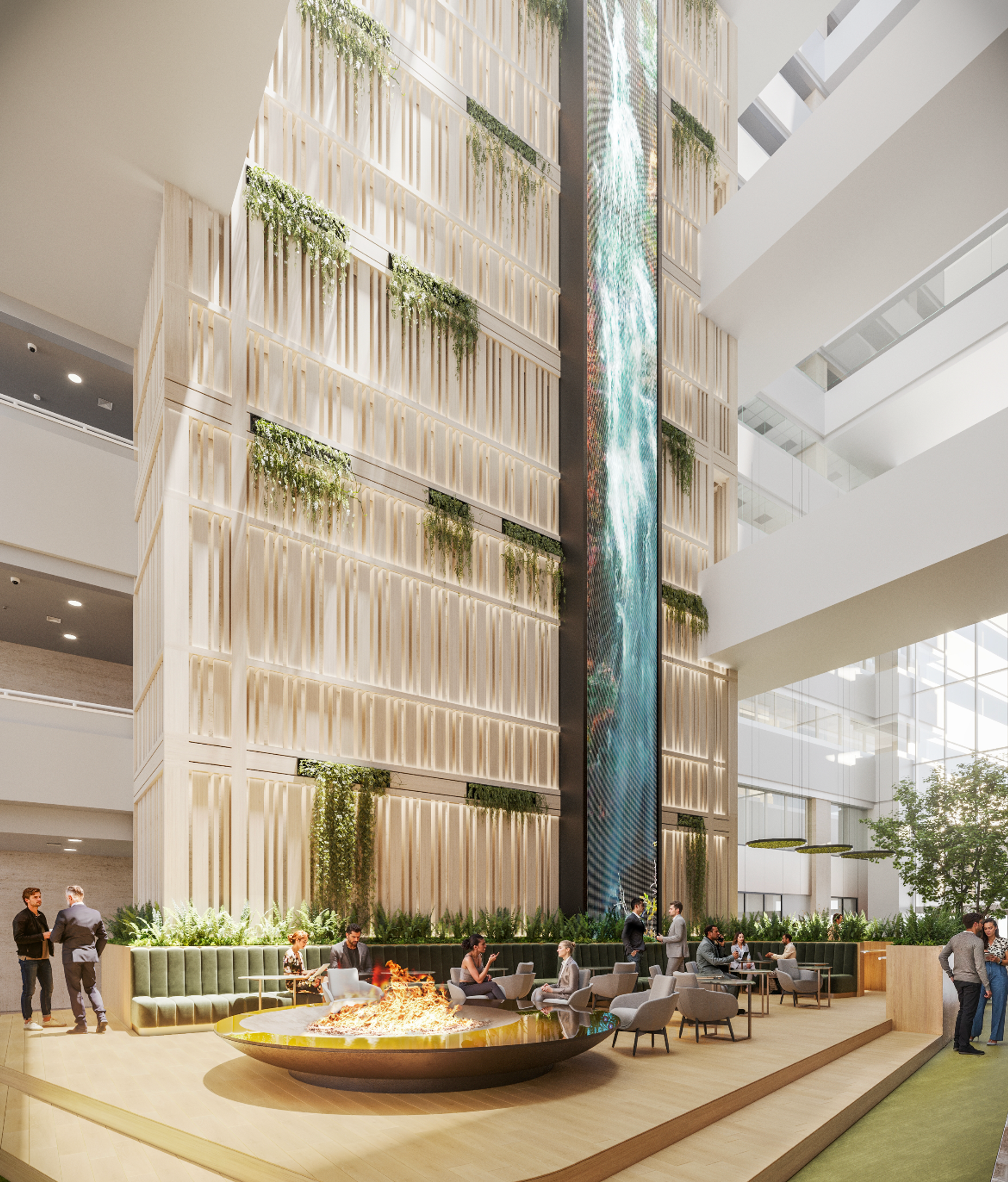 The setting: a 13-storey atrium lobby unlike any other in the city. Included in the upgrade: an 80-foot high decorative plant wall with an equally lofty digital art installation and a smokeless fire feature, along with sleek new seating areas. Also on the ground floor will be five new restaurants, which we’ll get to shortly.