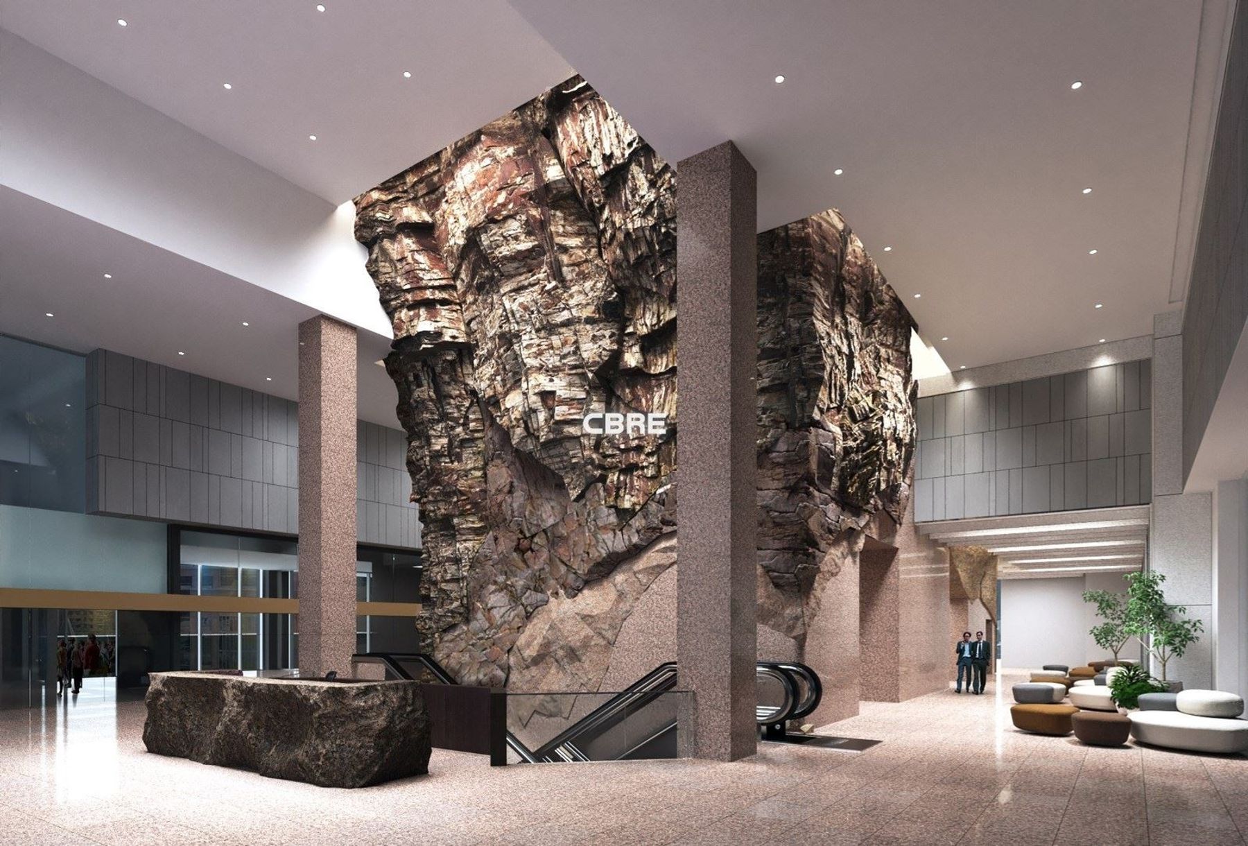 Completed in 1984, this office building isn’t exactly a spring chicken, but it’s got good bones, as Max Rosenfeld, EVP and Head of Asset Management at Crestpoint Real Estate Investments will tell you. “When it was built, they used a lot of this beautiful pink granite,” he tells STOREYS. “But it’s all polished slab, and there’s a lot of it, so there’s no breaks for the eye and there’s no interest.”