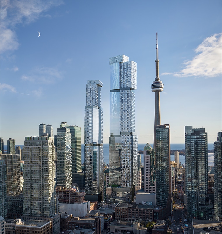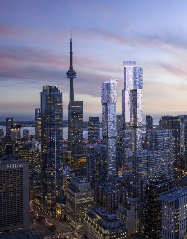 Designed by world-renowned architect and Toronto native Frank Gehry, Forma is a landmark two-tower development in downtown Toronto featuring over 2,000 residential units. Rising 73 and 84 storeys, the towers will include seven levels of office space, three levels of retail with a mezzanine, and dedicated space for the Ontario College of Art and Design University. Construction began in late 2022.